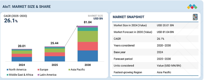 AIoT市場は、予測期間中に年平均成長率(CAGR)26.1%で成長し、2025年の254億4,000万米ドルから2030年までに810億4,000万米ドルに達すると見込まれている。スマートシティやスマートインフラの開発、クラウドコンピューティング、AI統合型エッジコンピューティングの進展が、AIoTの導入を徐々に促進しています。これらの技術は組織の効率性を高めるだけでなく、エネルギー効率化や持続可能性対策も担っており、スマートグリッドやスマート交通などの分野においてAIoTは不可欠な存在となっています。