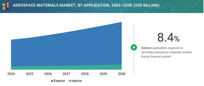 航空宇宙材料の主な用途は、内装および外装の各セグメントにまたがる。