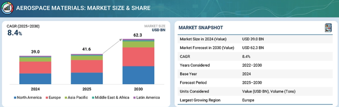 航空宇宙材料市場は、2025年から2030年にかけて年平均成長率8.4%で、2025年の416億米ドルから2030年には623億米ドルに達すると予測されています。航空宇宙材料市場の成長は、最新の航空機において優れた性能、効率性、持続可能性を実現する先端材料に対する需要の高まりに牽引されています。