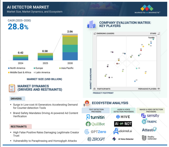 AI検知器市場は急拡大しており、2025年の約0.58億米ドルから2030年には年平均成長率28.8%で20.6億米ドルへと大幅な市場急拡大が予測されています。AI検出器市場は、剽窃および完全性ツールに対する学術機関からの需要が増加するにつれて、強い勢いを増しています。学生が生成AIを使用する機会が増えているため、大学や学校は課題の独創性を確保し、学術水準を守り、公正な評価慣行を維持するために高度な検出器を採用しています。同時に、選挙機関や市民プラットフォームは、誤報、合成メディア、未公表のAI作成テキストを選別し、民主主義の完全性を守るためにAI検出器の採用を増やしています。情報環境に関する国際パネル(IPIE)の報告によると、2024年には80%以上の国の選挙でAIが使用され、主にAIが生成したコンテンツ作成(インシデントの90%)が行われました。出所確認と選挙の完全性チェックは、商業エコシステムと市民エコシステムの両方において、AI検知を不可欠なセーフガードとして位置づける重要な推進要因として浮上しています。