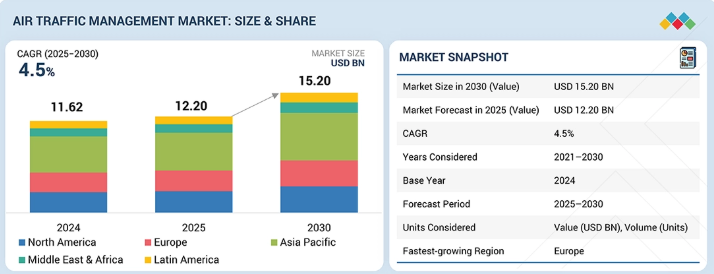 航空交通管理市場は、2025年に122億米ドルと評価され、2030年までに年平均成長率(CAGR)4.5%で152億米ドルに達すると予測されています。この市場の成長は、世界的な航空交通量の継続的な増加に牽引されており、効率性と安全性を維持しつつ容量を拡大するための先進システムへの継続的な投資ニーズが高まっています。同時に、近代化の取り組みやデジタル技術の導入により、より統合化・自動化された空域管理ソリューションへの移行が促進されています。