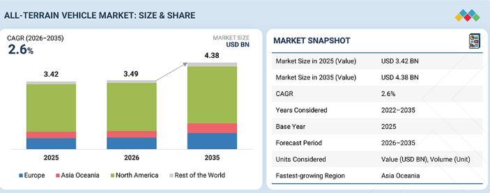 全地形対応車(ATV)市場は、2026年の34億9,000万米ドルから、2035年までに43億8,000万米ドルに達すると予測されており、年平均成長率(CAGR)は2.6%となる見込みです。アドベンチャー、オフロード走行、レクリエーション活動への関心の高まりが、全地形対応車(ATV)の需要を牽引しています。ATVは、農業・農作業、林業・土地管理、緊急・救助活動といった非レクリエーション用途でも利用されています。モータースポーツやその他のアドベンチャー活動の人気も、特に北米や欧州などの地域において、ATVの販売拡大に寄与しています。北米は、大規模で確立された消費者層、広範なオフロードおよびトレイルのインフラ、そしてアウトドアレクリエーションライディングの強い文化により、引き続き市場をリードしています。アジア・オセアニア地域は、所得の増加や、農業、建設、実用作業におけるATVの利用拡大がレクリエーション以外の分野での普及を後押ししているため、最も急速に成長する地域となる見込みです。