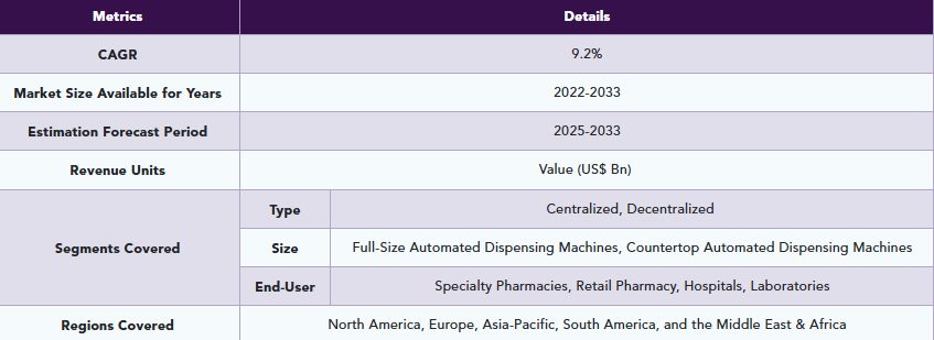 世界の自動調剤機市場(2025 – 2033):種類別、サイズ別、エンドユーザー別分析レポート