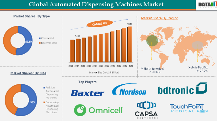 DataM Intelligenceのレポートによると、自動調剤機市場の規模は2024年に53億7,000万米ドルに達し、2033年までに103億7,000万米ドルに達すると予想されています。2025年から2033年の予測期間において、年平均成長率(CAGR)は7.9%で推移すると見込まれています。