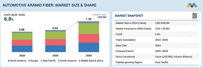 自動車用アラミド繊維市場は、2025年の9億4,000万米ドルから2030年までに13億米ドルに達すると予測されており、予測期間中に年平均成長率(CAGR)6.8%を記録する見込みである。電気自動車、高性能安全システム、軽量構造部品からの需要増加により、自動車用アラミド繊維市場は急成長している。各国は電気自動車インフラやグリーンモビリティ政策に多額の投資を行っており、特にバッテリーシステムにおいて耐熱性・電気絶縁ソリューションの需要が大幅に増加している。電動化と持続可能性への潮流、そして先進製造技術の影響により、自動車産業が次世代モビリティプラットフォームへ進化する中で、自動車用アラミド繊維市場は著しい成長が見込まれる。2023年4月、デュポンは自社ブランド「ケブラーEXO」を発表。これは画期的なパラアラミド繊維であり、50年以上にわたる同社最大の革新である。優れた防弾性能、軽量化、柔軟性と耐久性の向上を実現したケブラーEXOは、軍・法執行機関・緊急対応要員が使用するソフトボディアーマー向けに最適化されている。先進自動車材料への移行を牽引するのは、ケブラー(デュポン)、トワロンおよびテクノラ(帝人)、ヘラクローン(コロン工業)、アラウィン(東レ)といった主要アラミド繊維ブランドである。これらの信頼性の高いブランドは、卓越した機械的強度と熱安定性で知られるグローバルOEMおよびティア1サプライヤーから指定されるケースが増加しており、軽量構造部品、バッテリー熱管理、強化された車両安全システムにおけるイノベーションを推進している。