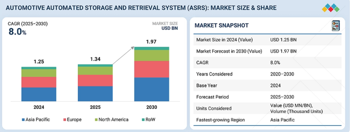 自動車向け自動倉庫システム(ASRS)市場は、2025年の13億4,000万米ドルから2030年までに19億7,000万米ドルへ成長し、年平均成長率(CAGR)8.0%を記録すると予測されている。市場拡大の要因としては、自動車製造工場における内部物流の自動化進展、生産量の増加、部品・サブアセンブリ・完成品の正確かつ高速な取り扱いニーズの高まりが挙げられる。制御ソフトウェア、ロボティクス、リアルタイム追跡、自動化された資材フロー管理の統合により、スループットの安定性、在庫精度、スペース利用率が向上し、先進的なASRSの導入が促進されている。さらに、自動車生産施設の継続的な近代化、電気自動車およびバッテリー製造の成長、運用効率と生産継続性の向上を目的とした投資が、世界の自動車セクター全体で需要を強化している。