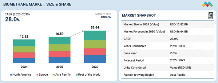 バイオメタン市場は、予測期間中に年平均成長率(CAGR)28.0%で成長し、2025年の推定165億米ドルから2030年までに566億4,000万米ドルに達すると見込まれている。バイオメタン市場は、脱炭素化目標、メタン排出削減義務、持続可能な廃棄物管理の必要性、再生可能ガスへの優遇措置、ならびに輸送・産業用途における既存ガスインフラとの互換性によって牽引されている。