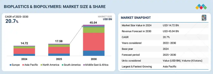 バイオプラスチック&バイオポリマーの世界市場規模は2030年までにCAGR 20.7%で拡大する見通し