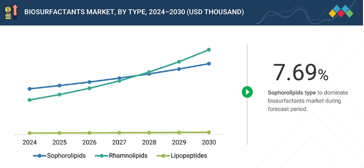 2025年から2030年にかけて、ラムノリピドセグメントがバイオサーファクタント市場で最高CAGR(16.27%)を記録すると予測。
