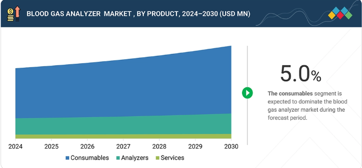 血液ガス分析装置市場は製品別に消耗品、分析装置、サービスに区分。消耗品セグメントは、ルーチンの血液ガス検査で繰り返し使用され、医療現場からの継続的な需要があることから、最大の市場シェアを占めています。カートリッジ、試薬、センサーは頻繁に交換されるため、このセグメントは安定した収益を確保できます。