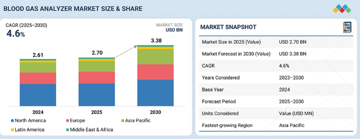 血液ガス分析装置市場は、2025年に27.0億米ドル、2030年には33.8億米ドルに達すると推定され、予測期間中の年平均成長率は4.6%と予測されています。成長の原動力となっているのは、慢性疾患や急性疾患の有病率の上昇、迅速かつ正確な診断に対する需要の高まり、血液ガス分析装置技術の継続的な進歩です。クリティカルケア、救急、呼吸管理の現場におけるポイントオブケア検査の採用が市場拡大をさらに後押ししています。患者転帰の改善と臨床ワークフローの最適化に重点を置く医療機関の増加により、最新の分析装置への投資が促進されています。さらに、発展途上地域における医療インフラの拡大は、市場参入企業にとって未開拓の需要を獲得する新たな機会となります。