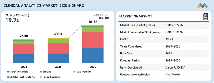 臨床分析市場は、2025年の330億9000万米ドルから2030年までに813億2000万米ドルに達すると予測されており、2025年から2030年までの年間平均成長率(CAGR)は19.7%となる見込みです。臨床分析市場の成長は主に、価値に基づく医療と償還モデルへの移行によって推進されており、医療機関はコスト削減を図りながら治療成果の向上を迫られています。実世界データ(RWE)に対する規制の開放性が高まることで、臨床および研究ワークフローへの高度な分析技術の統合が促進されている。さらに、スケーラブルなリアルタイムインサイトとシームレスな相互運用性を可能にするクラウドベースの現代的なデータプラットフォームの急速な採用が、市場の拡大をさらに加速させている。