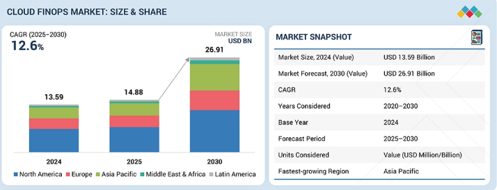 クラウドFinOps市場は、2025年の148億8000万米ドルから2030年までに269億1000万米ドルに達すると予測されており、年平均成長率(CAGR)は12.6%となる見込みです。成長の要因は、企業全体でのクラウド導入加速、AI集約型およびマルチクラウドワークロードによるコスト圧力の高まり、そして規律あるクラウド財務管理の必要性が増していることです。組織は、予算管理、無駄の削減、クラウド利用とビジネス成果の整合性を図りつつ運用上の俊敏性を維持するため、クラウドコスト最適化、FinOpsガバナンス、リアルタイム支出可視化を優先している。
