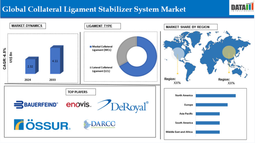 DataM Intelligenceのレポートによると、世界の側副靭帯安定化システム市場は2024年に23億2,000万米ドルに達し、2033年までに41億1,000万米ドルに達すると予測されています。2025年から2033年の予測期間中は、年平均成長率(CAGR)6.5%で成長すると見込まれています。