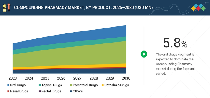 調剤薬局市場は、外用薬、経口薬、注射薬、直腸薬、鼻腔薬、点眼薬、その他の製品で構成される。経口薬は、個々の医療ニーズに対応する患者固有の治療法に合わせてカスタマイズされるため、広く使用されている。