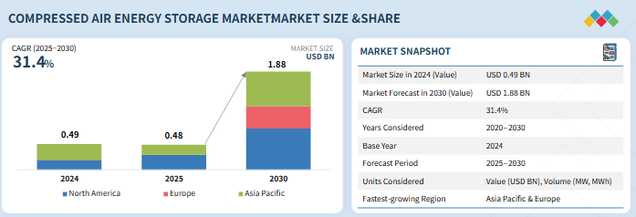 世界の圧縮空気エネルギー貯蔵(CAES)市場は、2025年の4億8000万米ドルから2030年までに18億8000万米ドルに達すると予測されており、年平均成長率(CAGR)は31.4%を記録する見込みです。再生可能エネルギー源の統合が進み、電力系統の不安定性を補うための長時間貯蔵の必要性が高まっていることから、市場は強い勢いを見せています。風力および太陽光発電の導入拡大により、電力系統の安定性とエネルギー安全保障を確保する信頼性の高い貯蔵技術への需要が生まれています。政府の支援策、カーボンニュートラル目標、エネルギーインフラ近代化への投資が、世界的なプロジェクト展開を加速させています。