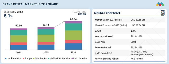 クレーンレンタル市場は、2025年の531億2000万米ドルから2030年までに680億4000万米ドルに達すると予測されており、2025年から2030年までの年間平均成長率(CAGR)は5.1%となる見込みです。クレーンレンタル市場の成長は、世界的に増加する大規模建設・インフラプロジェクトによって牽引されています。新興経済国におけるリフティング機器の需要増加は、急速な都市化と工業化に起因している。