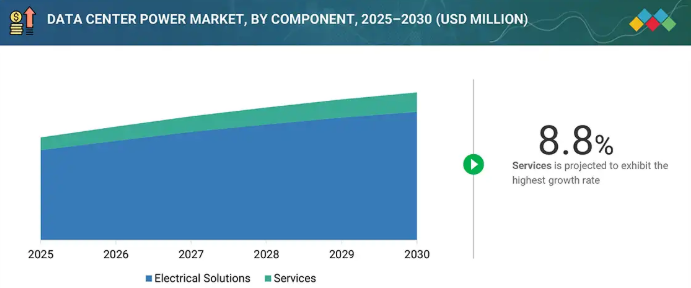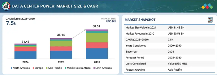 世界のデータセンター電力市場は大幅な成長が見込まれており、2025年の351億4,000万米ドルから2030年には505億1,000万米ドルに増加すると予測され、年平均成長率は7.5%です。データセンターの電力システムは、重要な業務に必要な信頼性の高い継続的な電力を確保し、大容量コンピューティング、クラウドサービス、ITインフラを可能にします。これらのシステムの市場は、AIやクラウドのワークロードの増加、エネルギー効率規制の強化、二酸化炭素排出量の削減とエネルギーコストの管理を行いながら運用の継続性を維持するデータセンターのニーズの高まりにより、急速に拡大しています。