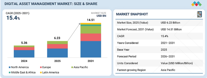 デジタルアセット管理(DAM)市場は、2025年の62億3,000万米ドルから、2031年までに145億1,000万米ドルに達すると予測されており、年平均成長率(CAGR)は15.4%となる見込みです。デジタルコンテンツ量の増加、一元化されたアセットリポジトリへの需要の高まり、オムニチャネル環境全体でのブランドの一貫性に対するニーズの高まりなど、多くの要因が世界のDAM市場の成長に寄与しています。企業は、画像、動画、文書、クリエイティブファイルを、より効率的に整理、保存、検索、管理、配信するために、DAMソリューションを導入しています。メタデータ管理、ワークフローの自動化、バージョン管理、リアルタイムコラボレーションへの需要の高まりに加え、コンテンツの再利用促進、キャンペーン実行の迅速化、マーケティングおよびクリエイティブ業務における重複の削減に企業が注力していることが、企業全体でのDAMプラットフォームの導入を後押ししています。