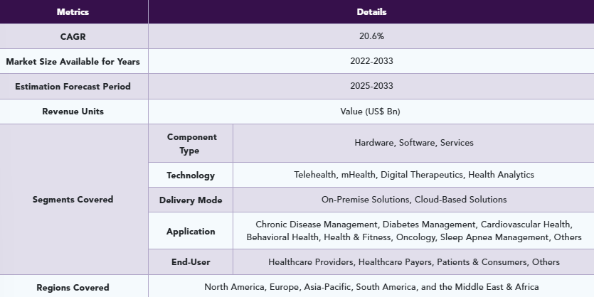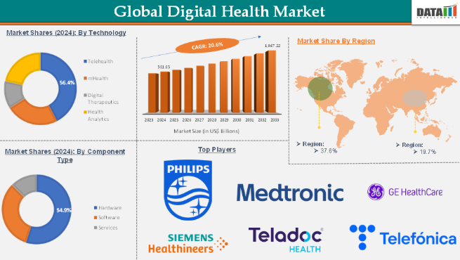 デジタルヘルス市場における世界の主要企業には、Koninklijke Philips N.V.、Medtronic plc、GE HealthCare、Siemens Healthineers AG、Apple Inc.、Teladoc Health, Inc.、Telefónica S.A.、AT&T、Veradigm LLC(Allscripts Healthcare Solutions Inc.)、AirStrip Technologies, Inc.などがあります。