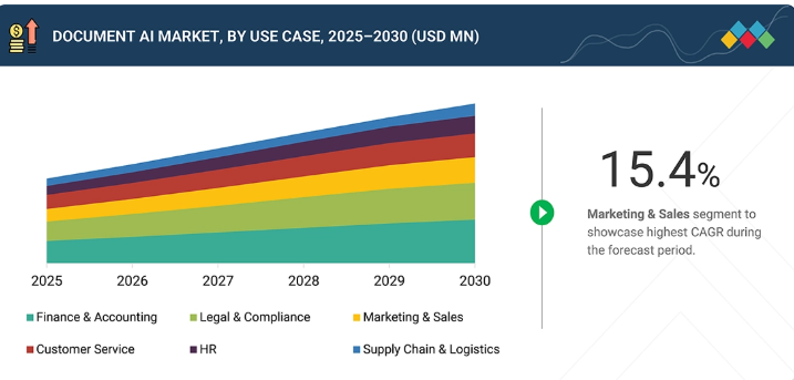 マーケティングおよび営業分野のユースケースが最も急速に成長すると予測される。インテリジェントなコンテンツ生成と顧客エンゲージメント自動化への需要拡大を背景に、企業がドキュメントAIを導入し、RFP(提案依頼書)対応の自動化、パーソナライズされた提案書の生成、キャンペーン資料からのインサイト抽出を行うためである。
