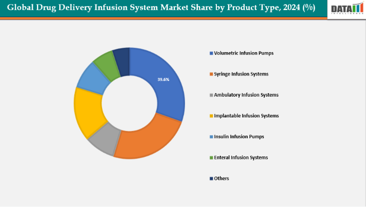 製品タイプ:製品タイプ別では、容積式輸液ポンプが2024年に39.6%のシェアを獲得し、薬物送達輸液システム市場を支配する見込みです。