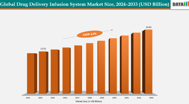 薬物送達輸液システムの世界市場規模は128億ドルに達し、2024年には135億5,000万ドルに増加し、2033年には226億2,000万ドルに達すると予測され、予測期間2025-2033年のCAGRは6.8%で成長する見込みです。世界の薬物送達輸液システム市場の主な成長要因は、技術の進歩、特に精密な輸液ポンプの開発です。2025年4月、ICU Medical Inc.は、IV Performance Platformに基づくPlum Soloおよび更新Plum DuoポンプのFDA 510(k)認可を取得しました。この事例は、精度と信頼性の向上を目指した技術革新が、患者の安全性を高めるだけでなく、先進的な輸液システムの採用を加速させ、技術を市場拡大の要にしていることを浮き彫りにしています。