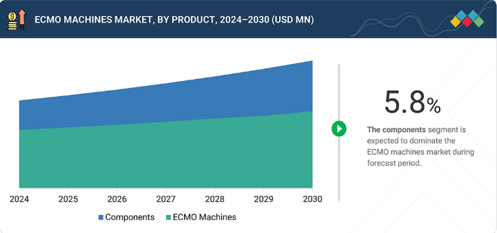 ECMO機器市場は製品別にコンポーネントとECMO機器に分類。2024年、世界のECMO機器市場で最大のシェアを占めるのはコンポーネント分野。肺移植のブリッジングや慢性心不全の場合の長期ECMOサポートには、耐久性のあるポンプと酸素供給器や付属品の頻繁な交換が必要。
