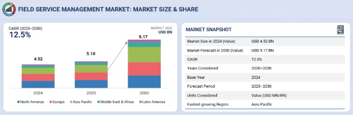 世界のフィールドサービス管理(FSM)市場は、急速なデジタルトランスフォーメーション、クラウド導入の増加、AI、IoT、アナリティクスなどの先進技術の統合を背景に、2025年の51億米ドルから2030年までに91億7000万米ドルへと著しい成長を遂げており、年平均成長率(CAGR)は12.5%に達する見込みである。製造業、公益事業、通信、医療業界の組織は、労働力管理の最適化、リアルタイム可視性の向上、サービス提供の改善を目的にFSMソリューションを導入している。自動スケジューリング、予知保全、モバイル対応プラットフォームへの需要は高まり続け、企業の業務効率と顧客満足度の向上を可能にしている。企業が接続性とデータ駆動型業務に注力する中、FSM市場はさらなる拡大が見込まれ、フィールド業務全体の拡張性、俊敏性、生産性を支える。