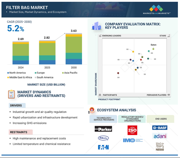 世界のフィルターバッグ市場は、環境規制の強化、産業の拡大、効率的な粉塵・汚染物質制御システムに対するニーズの高まりを背景に、2025年から2030年にかけて年平均成長率5.2%で成長し、2025年の28.2億米ドルから2030年には36.3億米ドルに達すると予測されています。フィルターバッグは、セメント、発電、化学、製薬、食品・飲料、鉱業の各産業において、排出基準の遵守、職場の安全性、持続可能な生産工程を保証します。高度なフィルターバッグシステムは、その高い効率性、費用対効果、適応性により、従来のろ過方法に急速に取って代わります。不織布、PTFE膜、耐高温素材などの技術進歩により、フィルターバッグはより耐久性が高く、厳しい産業作業に適しています。さらに、脱炭素化と持続可能な製造に向けた世界的なシフトは、カーボンフットプリントと有害な粒子状物質の排出を削減するため、産業界がより信頼性の高いろ過ソリューションを採用することを後押ししています。