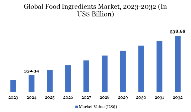 食品成分の市場規模は、2024年に3,523億4,000万米ドルに達し、2032年には5,386億8,000万米ドルに達すると予測され、予測期間2025年から2032年にかけての年平均成長率は5.45%で成長する見込みです。