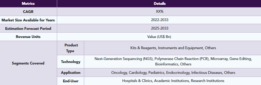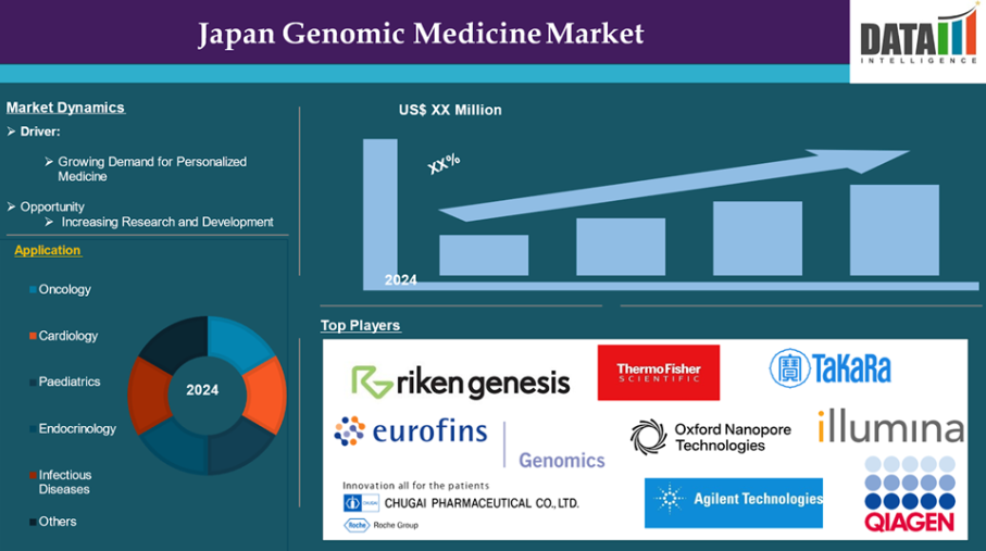 DataMのインテリジェンスレポートによると、日本のゲノム医療市場は2024年にXX百万米ドルに達し、2033年までにXX百万米ドルに達すると予想されています。2025年から2033年の予測期間において、年平均成長率(CAGR)XX%で成長すると見込まれています。