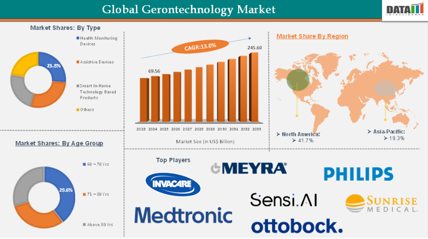 高齢者向け技術市場の主要企業には、Invacare Corporation、Karman Healthcare Inc.、Ottobock、Pride Mobility Products Corp.、Medtronic、Sunrise Medical、Meyra GmbH、Koninklijke Philips N.V.、Sensi.AI、Labrador Systems Inc.などが含まれる。
