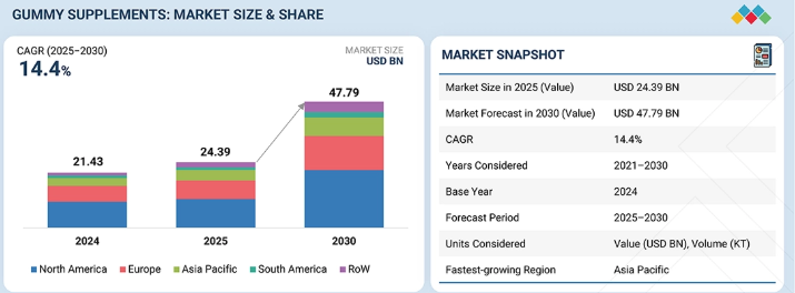 グミサプリメント市場は、2025年の243億9,000万米ドルから2030年までに477億9,000万米ドルへ成長し、予測期間中に年平均成長率(CAGR)14.4%を記録すると見込まれています。この成長は、健康志向のライフスタイルに合致した、便利で楽しく機能的な栄養摂取形態に対する消費者需要の高まりによって牽引されています。健康意識の高まりに伴い、メーカーは製品の安全性、有効性、規制順守を確保しつつ、免疫サポート、睡眠改善、ストレス緩和、内側から美しさを引き出す効果など、特定の効能を提供するグミの開発を優先しています。さらに、新興経済国における栄養補助食品の消費拡大や、クリーンラベル・植物由来・臨床裏付けのある処方に重点が置かれる傾向が強まる中、企業は世界市場における品質・透明性・競争力を維持するため、製剤技術・送達技術・原料調達における革新を迫られています。