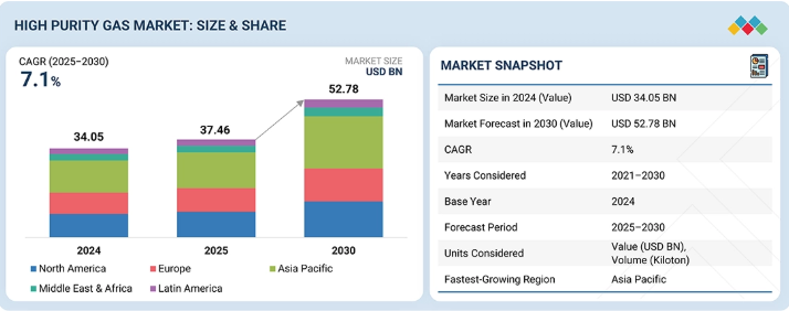 高純度ガス市場は、2025年の374億6,000万米ドルから2030年までに527億8,000万米ドルへ成長し、予測期間中に年平均成長率(CAGR)7.1%を記録すると予測されています。都市化の進展と、エレクトロニクス、金属生産、石油・ガス、化学、食品・飲料、医療・ヘルスケア産業における用途の拡大が、高純度ガスの需要を増加させています。