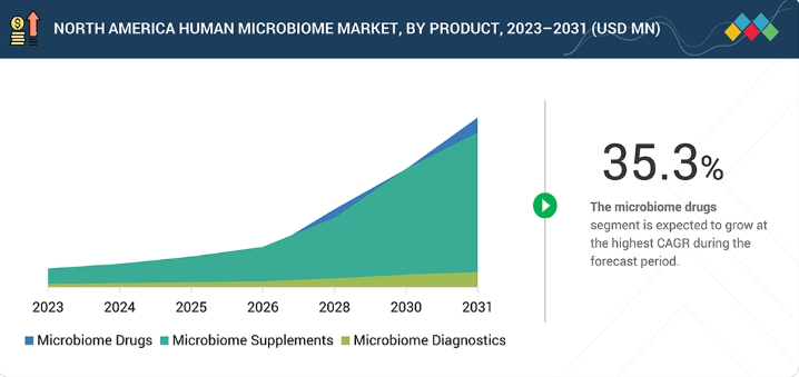 北米ヒトマイクロバイオーム市場、製品別(市場規模、2023年~2031年 – 価値ベース、百万米ドル)