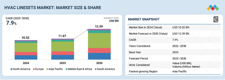 HVACラインセット市場は、予測期間中に年平均成長率(CAGR)7.9%で成長し、2025年の116億7,000万米ドルから2030年には125億9,000万米ドルに達すると予測されている。HVACラインセット市場の主な成長要因には、省エネ型HVACシステムへの需要増加、急速な都市化、住宅・商業ビル建設の拡大が含まれる。さらに、環境に優しい冷媒の採用拡大と老朽化したHVACインフラの更新が市場成長をさらに促進している。