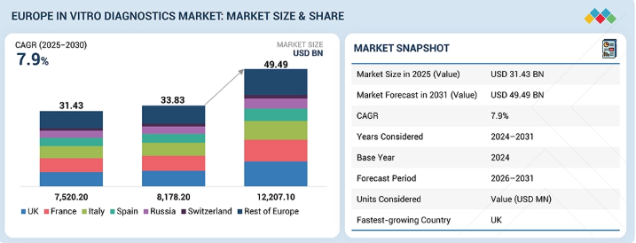欧州の体外診断薬(IVD)市場は、2025年に314億3000万米ドルと評価され、2026年には338億3000万米ドルに達した。2026年から2031年にかけては7.9%という堅調なCAGRで成長し、期間末には494億9000万米ドルに達すると予測されている。市場成長は、各国医療システムにおける診断検査量の増加、人口ベースのスクリーニングプログラムの普及拡大、標準化された疾病モニタリングへの注力強化によって牽引されている。検査室の自動化と先進的分子診断技術の導入拡大は、検査効率をさらに向上させると同時に、人材不足の問題にも対応している。加えて、医療インフラ近代化への継続的な投資が、地域全体におけるIVD市場の持続的拡大を支え続けている。