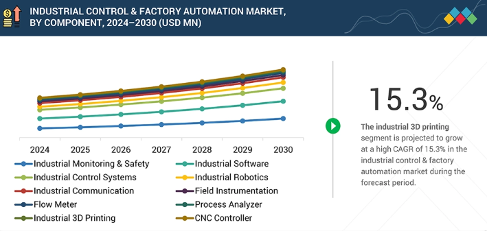 構成要素別では、産業用3Dプリンティング分野が2025年から2030年にかけて産業用制御・工場自動化市場で15.3%の高いCAGRで成長すると予測される。