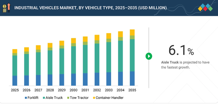 産業用車両市場は、技術革新、消費者の嗜好の変化、および規制面の支援によって形作られ、急速に進化しています。炭素排出量を削減するための自動化や電動化といった先進技術の統合に対する需要の高まりが、産業用車両市場を牽引すると予想されます。また、Eコマースや倉庫業界の人気の高まりも、産業用車両市場の成長をさらに促進すると見込まれています。