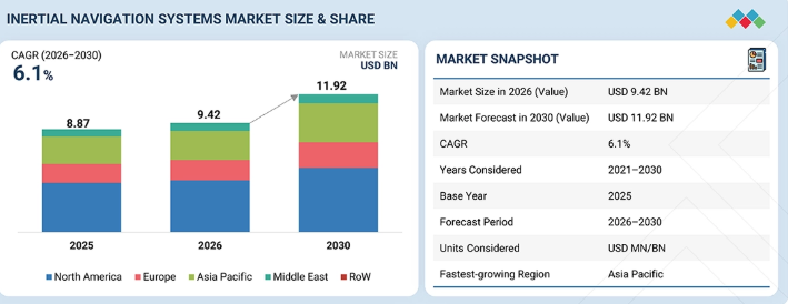 慣性航法システム市場は、2026年に94億2,000万米ドルと推定されており、2030年までに119億2,000万米ドルに達すると予測されています。2026年から2030年までの年間平均成長率(CAGR)は6.1%となる見込みです。市場の成長は、防衛および商用プラットフォームにおける正確な航法への需要の高まりに加え、GPSが利用できない環境下での信頼性の高いシステムへのニーズの増加によって牽引されています。
