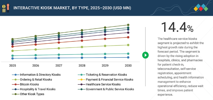 インタラクティブキオスク市場は、予測期間中に年平均成長率(CAGR)10.3%で成長し、2025年の218億5,000万米ドルから2030年までに356億5,000万米ドルに達すると予測されている。小売、ホスピタリティ、交通、銀行、医療、政府部門におけるインタラクティブキオスクの導入拡大が市場を牽引している。セルフサービス自動化、非接触取引、顧客エンゲージメント強化への需要増加が導入を促進している。さらに、タッチ技術の発展、AIベースのパーソナライゼーション、クラウド統合型キオスク管理プラットフォームの進歩が市場拡大を加速させている。運輸分野では、空港や地下鉄駅が自動発券や乗客支援のためのデジタルキオスク導入を拡大中であり、小売・QSR環境ではインタラクティブキオスクがセルフチェックアウト、注文、ロイヤルティ登録を実現している。スマートシティプロジェクトやデジタル公共サービスイニシアチブの拡大が、世界的なインタラクティブキオスク導入をさらに強化している。