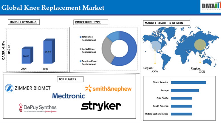 DataMインテリジェンスのレポートによると、世界の膝関節置換術市場は2024年に108億5,000万米ドルに達し、2033年までに167億2,000万米ドルに達すると予想されています。2025年から2033年の予測期間中は、年平均成長率(CAGR)4.8%で成長すると見込まれています。