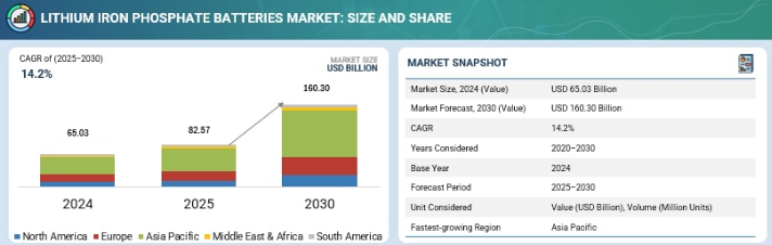 世界のリン酸鉄リチウム電池市場は、2025年の825億7,000万米ドルから2030年までに1,603億米ドルに達すると予測されており、予測期間中の年平均成長率(CAGR)は14.2%を記録する見込みです。リン酸鉄リチウム電池は、従来のリン酸鉄リチウム電池と比較して安全性が高く、寿命が長く、熱安定性に優れながらコスト効率を維持できるため、採用が拡大しています。