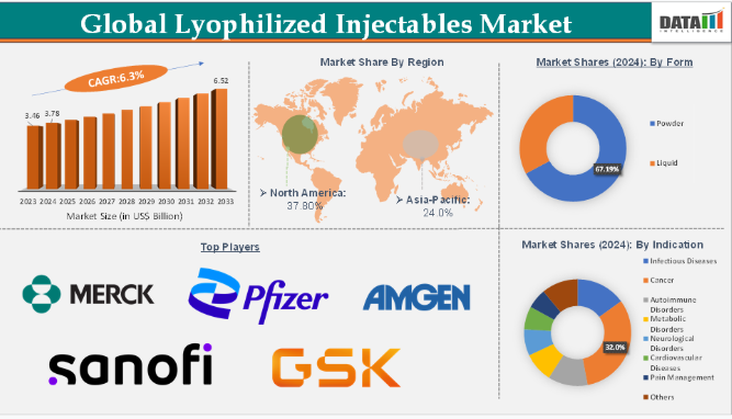 DMIの分析によると、凍結乾燥注射剤市場規模は2024年に37億8,000万米ドルに達し、2025年から2033年の予測期間中に年平均成長率(CAGR)6.3%で成長し、2033年までに65億2,000万米ドルに達すると予想されています。凍結乾燥注射剤市場は、主に生物学的製剤およびバイオシミラーの採用拡大、ワクチン接種プログラムの拡充、凍結乾燥プロセスの技術進歩に牽引され、世界的に堅調な成長を遂げている。凍結乾燥技術は、モノクローナル抗体、ペプチド、ワクチンなどの生物学的製剤をはじめとする、安定性・保存期間・有効性が求められる注射剤の製剤技術として依然として重要である。