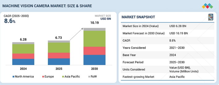 マシンビジョンカメラ市場は、2025年の67億3000万米ドルから2030年までに101億9000万米ドルに達すると予測されており、予測期間中に年平均成長率(CAGR)8.6%で成長する見込みである。市場拡大は、電子機器、自動車、包装産業における自動化の加速と、高速・高解像度撮像への需要増加によって牽引されている。CMOSセンサーと高帯域幅インターフェースの進歩、スマートカメラやエッジAIシステムの採用拡大、半導体・EVバッテリー・電子機器製造分野での機会拡大が相まって、世界的な市場勢いをさらに強化している。