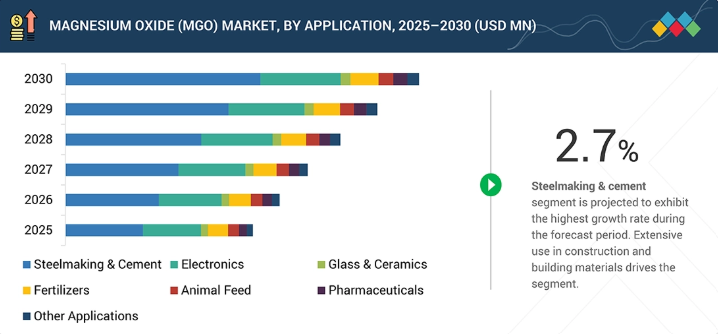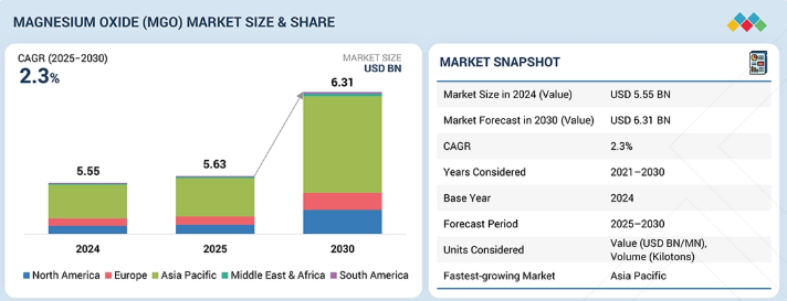 酸化マグネシウム(MgO)市場は、2025年の56億3000万米ドルから2030年までに63億1000万米ドルに達すると予測されており、2025年から2030年にかけて年平均成長率(CAGR)2.3%を記録する見込みである。この市場成長は、鉄鋼生産量の増加、高度な耐火物用途への需要拡大、建設・建築資材における広範な使用、および先進セラミックス・電子部品分野での応用拡大に起因する。