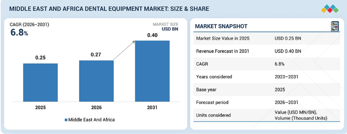 中東・アフリカ地域の歯科機器市場は、2025年に0.25億米ドルと評価され、2026年には0.27億米ドルに達した。2026年から2031年にかけては堅調な年平均成長率(CAGR)6.8%で拡大し、期間末には0.40億米ドルに達すると予測されている。歯科機器は、歯科診療における口腔健康状態の診断、治療、管理を支援するために設計された幅広い医療技術で構成される。これらの機器には、歯科用チェアや歯科ユニットなどの治療機器と、歯科用画像診断システム、デジタルX線装置、CBCTスキャナーなどの診断技術が含まれる。用途に応じて、歯科医療機器は日常的な歯科治療で使用される一般的な器具から、高度に専門的な処置を可能にする先進システムまで多岐にわたる。これらの製品は、歯科病院や歯科医院において、効果的で安全かつ高品質な患者ケアを確保するために不可欠である。