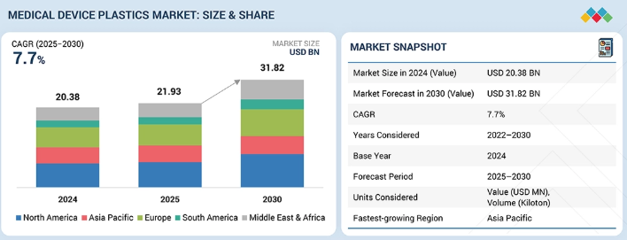 世界の医療機器用プラスチック市場は、2025年の219億3000万米ドルから2030年までに318億2000万米ドルに達すると予測されており、2025年から2030年までの年間平均成長率(CAGR)は7.7%となる見込みです。この市場の成長は、医療費支出の増加、軽量でコスト効率の高い材料への需要の高まり、医療技術の急速な進歩によって牽引されています。感染管理のための単回使用・使い捨てデバイスへの移行と、低侵襲医療機器やウェアラブル医療機器における応用拡大が、市場の強い成長勢いを牽引している。