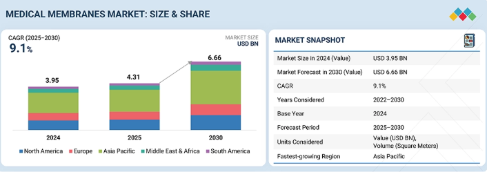 医療用膜市場は、予測期間中に年平均成長率(CAGR)9.1%で成長し、2025年の43億1000万米ドルから2030年には66億6000万米ドルに達すると予測されている。この市場の主な成長要因は、慢性腎臓病および糖尿病の有病率上昇、血液透析需要の増加、高度な濾過技術を必要とするバイオ医薬品生産の急成長である。生体適合性、防汚性、高性能膜の技術進歩に加え、新興国における医療インフラの拡充が市場の拡大をさらに加速させている。